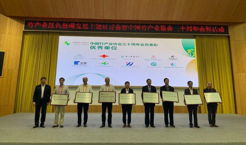 會上舉行了隆重的表彰儀式,浙江農林大學被評為中國竹產業協會三十周年優秀單位,竹子研究院相關負責人代表學校領獎。