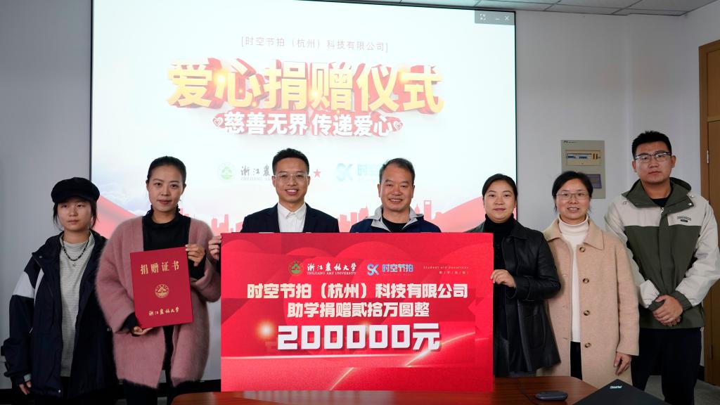 捐贈儀式上,學院領導向捐贈企業表示感謝,同時希望今后能與公司在數智教育、競賽育人等方面進一步加強合作。捐贈方代表厲軍表達了對母校的感恩之情,并希望公司和學院能在產學研、人才培養、實習實踐等方面深度合作,為學生提供更多的實習實踐機會和更好的平臺。儀式最后,時空節拍(杭州)科技有限公司向學校捐贈20萬元用于文法學院教育發展項目,學院黨委書記朱紅東為其頒發捐贈證書,并合影留念。