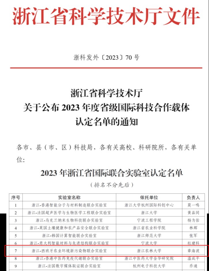 近日,浙江省科學技術廳下發了《浙江省科學技術廳關于公布2023年度省級國際科技合作載體認定名單的通知》(浙科發外〔2023〕70號),由環資院、碳中和學院環境科學與工程學科申報的“浙江-西班牙農業環境新污染物聯合實驗室”獲得科技廳認定成為省級國際合作平臺。