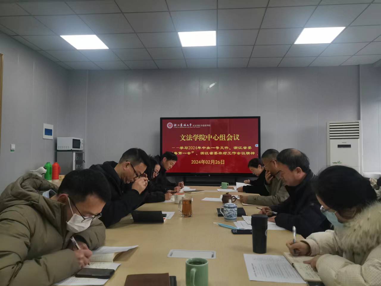 2月26日下午,文法學院召開中心組學習會,專題學習2024年中央一號文件精神,學習浙江省委“新春第一會”及農村工作會議精神。中心組成員參加學習,黨委書記朱紅東主持學習會。