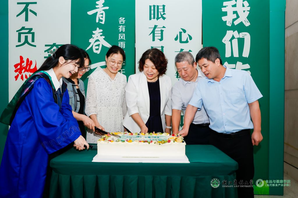 食健學院還精心為畢業生準備了以“拾光·餞行”為主題的感恩話別活動——師生紅毯秀和畢業冷餐會。學院黨政班子成員與畢業生代表共同切下“拾光·餞行”主題蛋糕,共話師生情、再敘同窗誼,象征著師生約定不言再見的“浙農林食健之約”。愿全體畢業生帶著母院的誠摯祝福和師長們的諄諄教誨,牢記初心,砥礪前行,不負時代,不負韶華,成就更加卓越的自我。