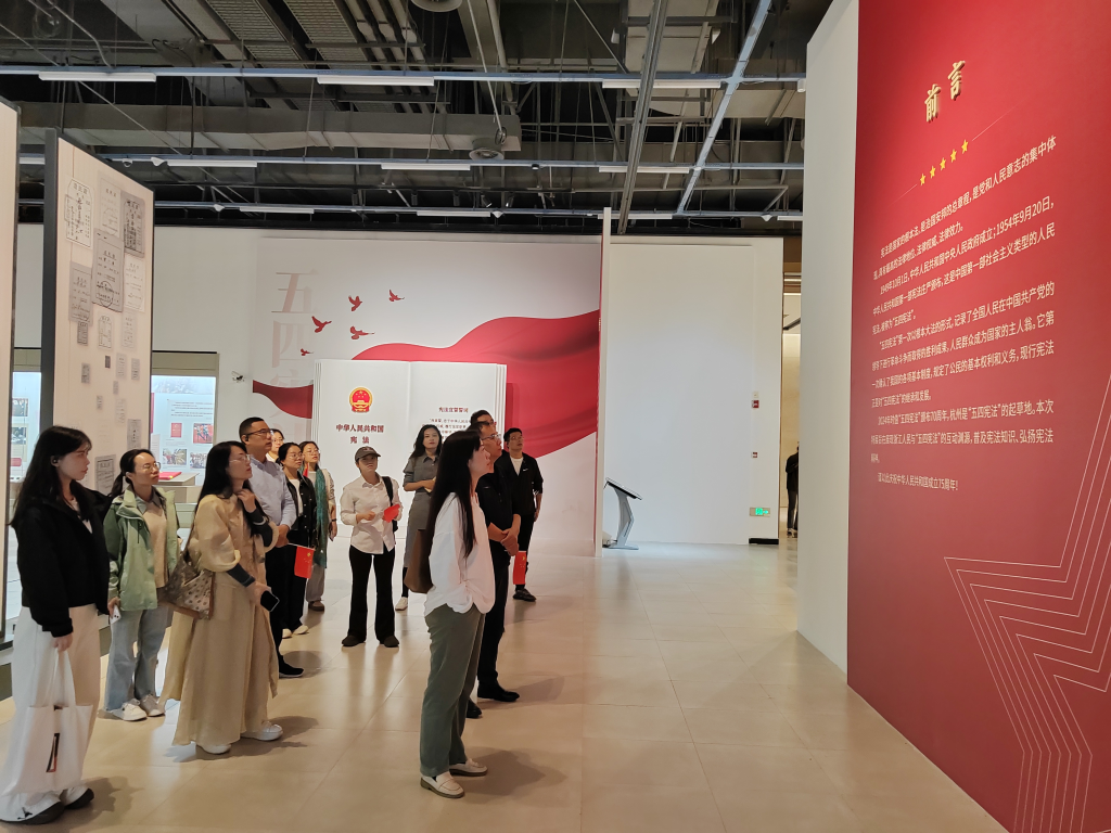 在省博之江館“‘五四憲法’的故事——紀念中華人民共和國第一部憲法頒布70周年”特展,大家重點學習了新中國第一步憲法(五四憲法)起草的時代背景和起草、討論、通過到實施的“誕生”全過程。在中國美術學院“為新中國設計——慶祝中華人民共和國成立75周年”系列特展,大家認真了解了新中國初期國旗、國徽、人民大會堂等重大設計過程和各時期的設計文化面貌。
