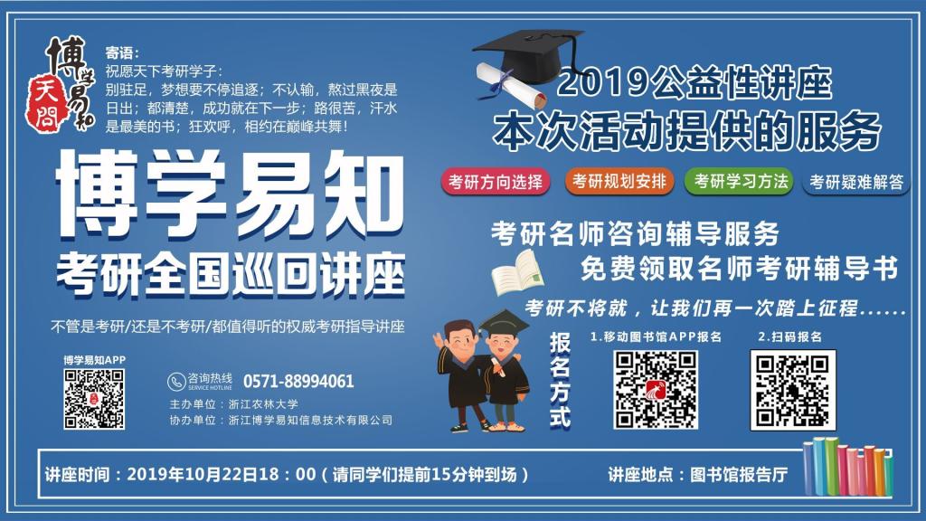 為滿足今年正在準備考研的在校考生更清晰地了解本年考研情況,做好考前沖刺的準備工作;同時也使未來準備考研的同學更好的了解考研,解除對考研的疑惑,消除對考研的心理壓力,能夠正確地認識考研,動員更多的學生加入到考研的隊伍中來,浙江農林大學圖書館和浙江博學易知信息技術有限公司合作開設本次考研講座。